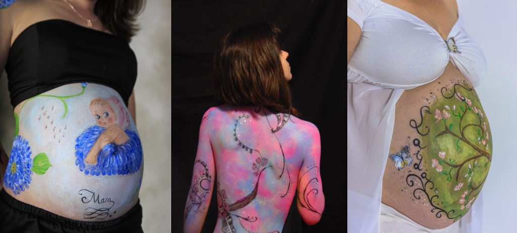 ¿Qué tipo de materiales se utilizan y cuánto tiempo duran en la piel? Utilizo pinturas naturales al agua sin perfumes ni parabenos, totalmente inocuas tanto para la amatxu como para el bebé. Nunca utilizo un maquillaje sin probarlo en mí antes. Es una pintura que se activa con el agua y se borra de la misma forma, así que dura hasta que entra en contacto con ésta. En los últimos meses estoy con un proyecto con otro tipo de pigmento que dura alrededor de una semana en la piel y que también pueden solicitar sin ningún miedo.
