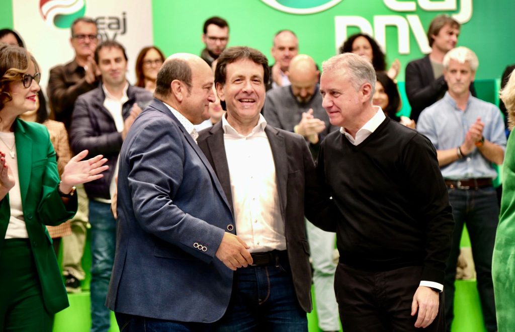 Andoni Ortuzar (izq.), Asier Iragorri (centro) y el lehendakari Urkullu (drcha.) durante un acto de la campaña en Basauri / EAJ-PNV