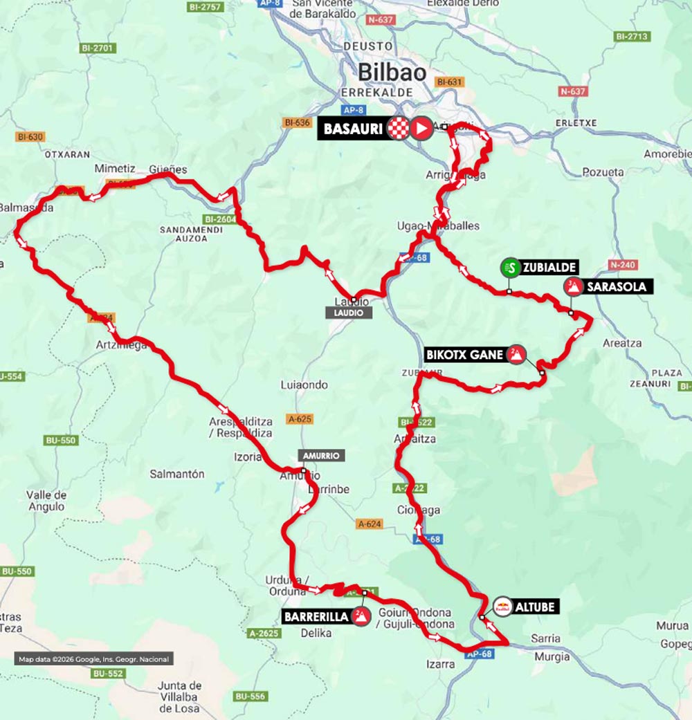 Los equipos y ciclistas comenzarán a concentrarse a partir de las 12:00 horas en la plaza San Fausto, mientras que la salida neutralizada tendrá lugar a las 13:28 desde el Social Antzokia. El inicio real de la etapa será a las 13:40 en la N-625, desde donde el pelotón pondrá rumbo hacia Arrigorriaga y Ugao. A lo largo del recorrido, los corredores atravesarán localidades como Arrankudiaga, Laudio, Amurrio o Artziniega, además de afrontar varios puertos de montaña como Barrerilla, Altube o Bikotx-Gane, en un trazado que combina tramos llanos con ascensiones.